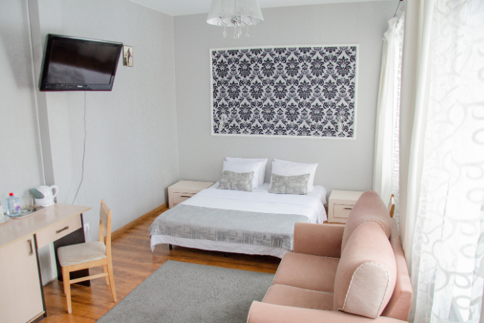 - Просторный номер оснащен кроватью шириной 160 см, также в номере имеется диван, который при необходимости можно использовать как дополнительное место.